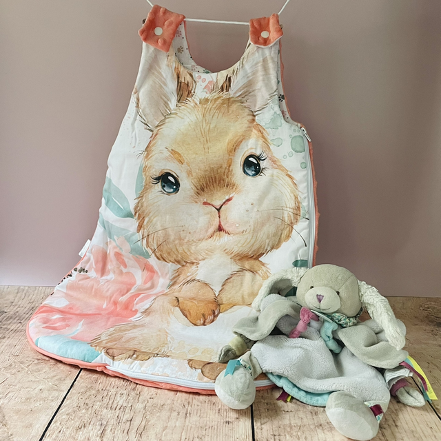 Confectionnée dans des tissus doux comme un nuage, cette gigoteuse enveloppe votre enfant de confort et de tendresse, tandis que lapinou, compagnon des rêves, veille sur ses nuits paisibles.