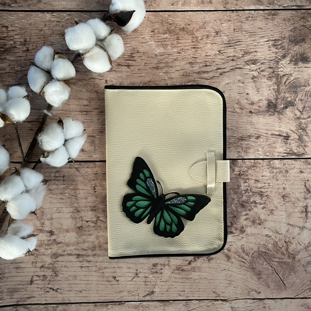 Le Protège carnet de santé en simili cuir, est orné d’un motif papillon en 3D.